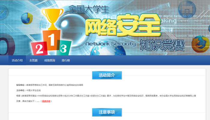 2、组织参加“全国大学生网络安全知识竞赛” 2014年11月至12月教育部思政司指导大学生在线组织开展“全国大学生网络安全知识竞赛”,将于11月25日在中国大学生在线网站启动。各系要积极组织学生参与网上答题和线下活动,激发学生学习网络安全知识兴趣,提升网络安全防护技能。