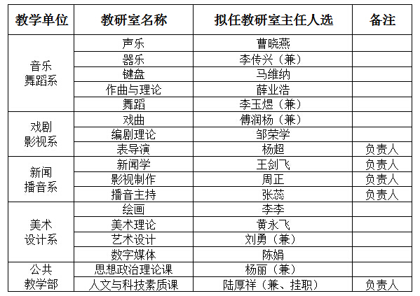 根据《安徽大学艺术与传媒学院基层教学组织建设指导性意见(试行)》(院政【2016】2号)及学院2016年1月12日党委会议精神,学院组织人事处、教务处组织了各系对教研室主任拟任人选的推选工作。经过系(部)主任推荐,所在直属党支部考察,系(部)党政联席会议研究,组织人事处、教务处审查等环节,2016年4月1日院长办公会议研究通过了曹晓燕等17位同志为声乐等17个教研室主任(负责人)拟任人选。现予以公示。