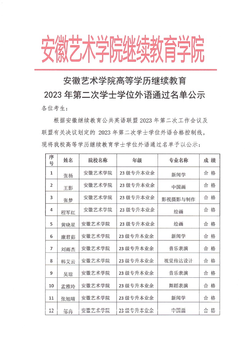 新利体育首页官网高等学历继续教育2023年第二次学士学位外语通过名单公示