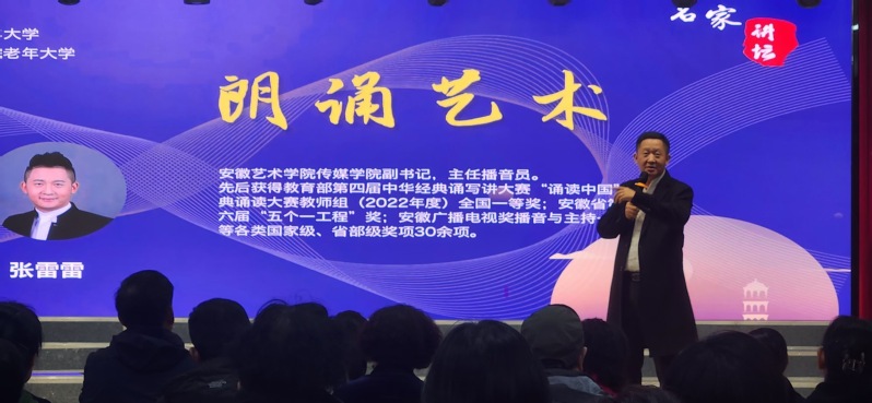 11月10日下午,新利体育首页官网老年大学在淮北相城老年大学教学点的本学期“名家讲堂”第二期开课,我校传媒学院张雷雷副教授赴淮北相城老年大学教学点,作《朗诵艺术》名师讲坛专家讲座,现场座无虚席。