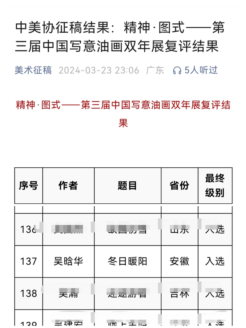 3月23日,从中国美术家协会官网获悉,安徽非遗艺术研究中心副主任、美术学院教师吴晗华油画作品《冬日暖阳》入选《精神·图式——第三届中国写意油画双年展》。