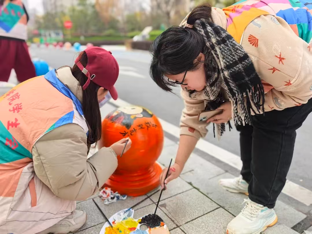 12月7日,美术学院“青春书画行”志愿服务队在辖区磨店家园同祥苑小区内开展“民族彩韵绘石墩,团结之花绽新辉”铸牢中华民族共同体意识主题彩绘活动,以小区广场及周边的56个石墩为画布,绘制56个民族的卡通形象。