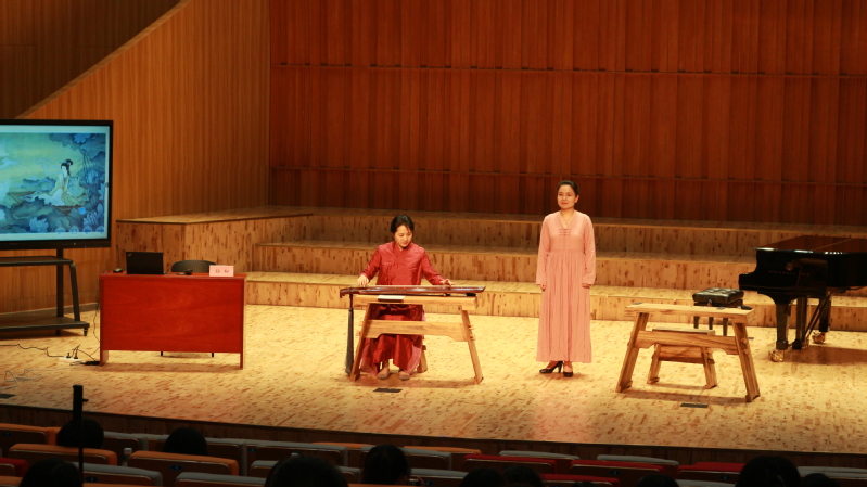 随后,孙知和特邀嘉宾安徽艺术职业学院声乐教研室主任朱晓慧老师联袂演绎经典琴曲《如梦令》,在婉转的琴声和悠扬歌声中,展现了古琴音、乐和谐的知音之美。现场还呈现了学生合奏曲目《大鱼海棠》、孙知独奏古琴经典曲目《流水》等不同风格、不同演奏形式的琴曲,充分展示了古琴带来的空灵与天籁之音,在场师生在这充满雅乐古韵的视听盛宴中逐渐放空心灵,感受到人、琴、自然相和谐的“天人合一”精神境界,领略到古琴魅力。活动结束后,学生们纷纷近距离体验感受古琴的独特魅力。