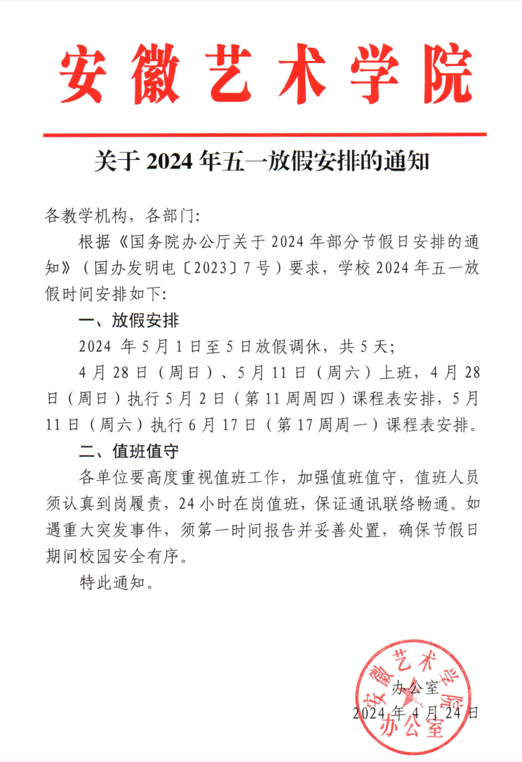 关于2024年五一放假安排的通知