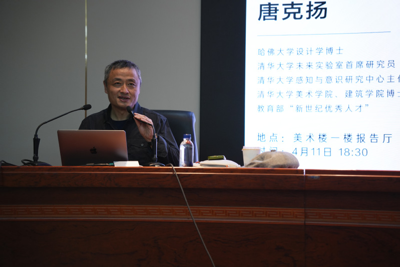 4月11日18:30,设计学院学术季系列讲座《从室内的故事到空间之诗》在美术楼报告厅举行。讲座特邀清华大学未来实验室首席研究员、感知与意识研究中心主任、清华大学美术学院与建筑学院博士生导师唐克扬教授主讲,由设计学院副院长撒后余教授主持。设计学院部分教师与学生到场聆听,讲座现场,气氛热烈。