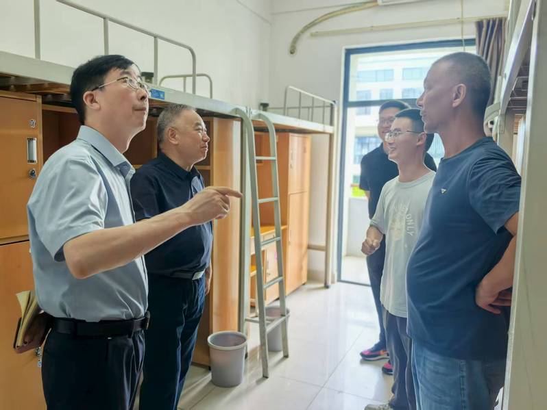 调研首站为学生东区宿舍。巡查组实地查看2025级新生宿舍样板间,物业维修科负责人详细汇报了宿舍维修重点项目及工期安排。陈文兵仔细询问漏水等突出问题的解决方案,并强调要于8月中旬前完成新生入住准备工作,确保新生顺利报到入住。