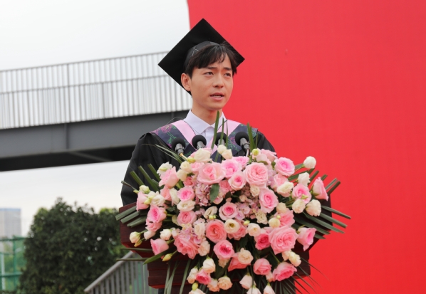 优秀毕业生代表李威深情回忆艺馨湖畔的草地音乐会、放学时漫天的晚霞,感叹“关关难过,关关过”,再回首风起四海,母校是永远的青春代名词。