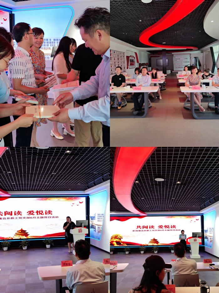 为进一步提高党员修养,提升精神境界和教学能力,6月8日中午,新闻播音系教工党支部在VR活动室开展了以“共阅读 爱悦读”为内容的主题党日活动。校党委委员、办公室主任曹晓富,新闻播音系党总支副书记曹磊,教工支部全体党员和入党积极分子参加活动。